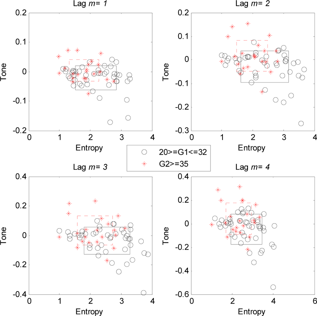 Mean tone and entropy values for both the G1 and G2 group for all lags (1 ≤ m ≤ 8) are shown in Figure 3. Mean tone values are lower for all lags in the G1 group compared to the G2 group (upper panel). In addition mean tone values in the G1 group consistently decrease with increasing lag. On the other hand, mean entropy values are higher in the G1 than G2 group for all lags (Figure 3 lower panel). The mean entropy values in both groups are mostly increased with increasing lags (Table 1, Figure 3).