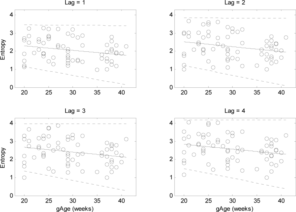 Correlation between entropy and gestational age at lags m = 1–4. Table 2 summarizes the values (correlation coefficients and significance). Solid lines represent the means and dotted lines represent the 95% confidence levels.