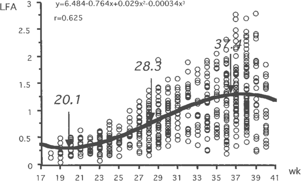 Alteration of low-frequency area (LFA) of the spectrum of heart beat fluctuation in normal foetuses during pregnancy [1].