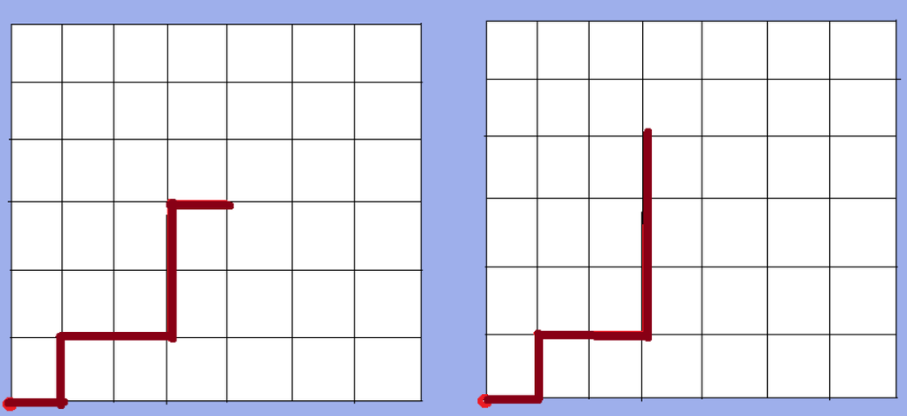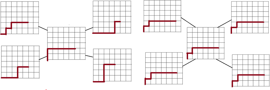 Example of a lattice-based reconfigurable system: the robotic arm. The edges in color indicate the presence of a unit module; a black edge indicates its absence. The arm is attached at its base point (0, 0). Here, an elementary movement has been performed by the module at the end of the arm, which changes the overall form of the system.