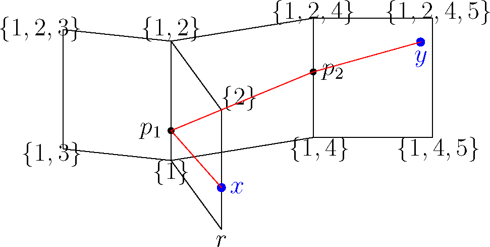We denote by Iw = {i ∈ {1,…N}|wi = 1}, the order ideal associated with the vertex w. Now that the complex is re-rooted, we need to find the cubical sequence that contains the geodesic between x and y. According to [14], a valid sequence (Ck)1≤k≤n = (Ik, Mk)1≤k≤n of cubes containing the geodesic, consists of a sequence of order ideals I1 ⊂ I2 ⊂ ⋯ ⊂ In = Iw and maximal antichains Mk ⊂ Ik, 1 ≤ k ≤ n (see Appendix B for the representation of individual cubes of a complex). To find this sequence, we take the subset of minimal elements of Iw and I1, and set M1 = I1. Then, in order to form Ck = (Ik, Mk) from Ck−1 = (Ik−1, Mk−1), we take the subset of minimal elements mk of Q−Ik−1, put Ik = Ik−1 ∪ mk and let Mk be the maximal antichain of Ik. Using this procedure until Ik = P, we obtain a valid cube sequence, which contains the geodesic. In the example of Figures 3 and 4, we have: I1 = {2, 3}, M1 = {2, 3} and I2 = {2, 3, 4}, M2 = {2}.
