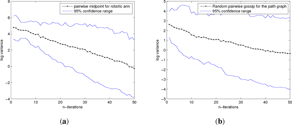 Plot of n → log σ2 for a network of k = 10 robotic arms with n = 7 articulations. (a) The underlying communications graph is the complete graph, while on (b), it is the path graph. Because of the stochastic nature of the algorithm, the procedure is averaged over 30 runs. The resulting curve is a line of a negative slope of bigger magnitude for the complete graph than for the path graph.