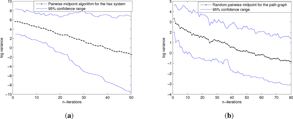Plot of n → log σ2 for a network of k = 10 hexagonal systems. (a) The underlying communications graph is the complete graph, while on (b), it is the path graph. Because of the stochastic nature of the algorithm, the procedure is averaged over 30 runs. The resulting curve is a line of a negative slope of bigger magnitude for the complete graph than for the path graph.