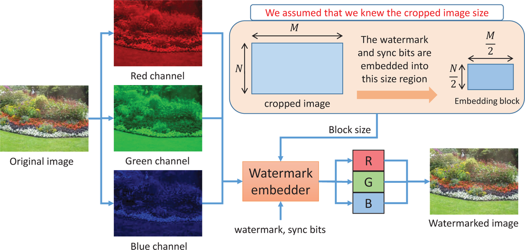 The First International Workshop on Information Hiding and Its Criteria for Evaluation (IWIHC2014) ( http://www.ieice.org/iss/emm/ihc/en/iwihc2014/), which included a watermarking competition, was held in Japan in conjunction with a major security conference, called ASIACCS2014 (ACM Symposium on Information, Computer and Communications Security). This workshop aimed at ascertaining the current state-of-the-art in digital watermarking algorithms. Only a few methods have been reported that satisfy the watermark criteria for images [19–22]. In this workshop, we presented results in two competition categories: highest tolerance and highest image quality. In particular, we used the difference of the frequency coefficients derived from a discrete cosine transform and an error-correcting code (ECC) to satisfy the requirements of the Information Hiding and its Criteria [23], which both require coding tolerance and cropping tolerance.