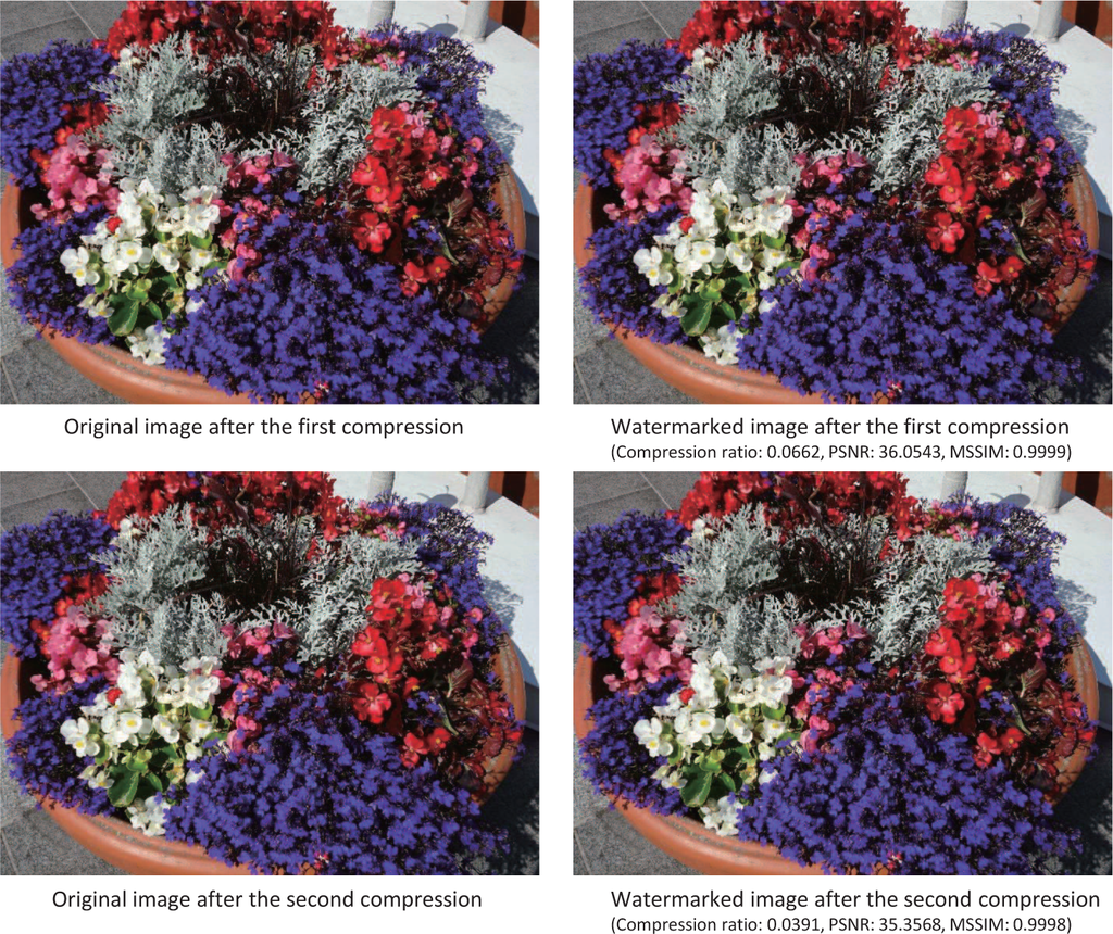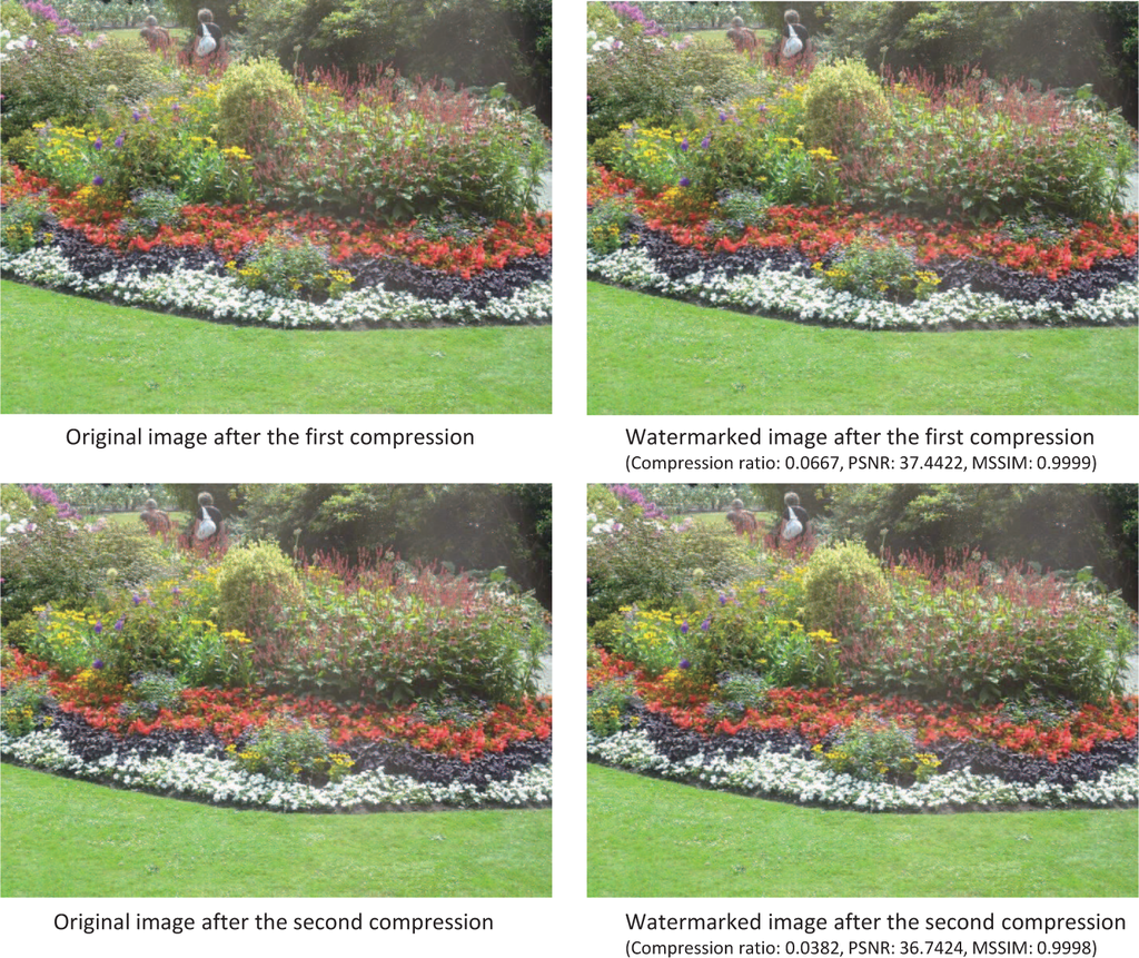 The results shown in Table 4 demonstrate that these criteria were satisfied. The highest average PSNR was 37.0869 for the highest image quality after the second compression. In particular, the MSSIM indicated that we obtained a high level of structural similarity.