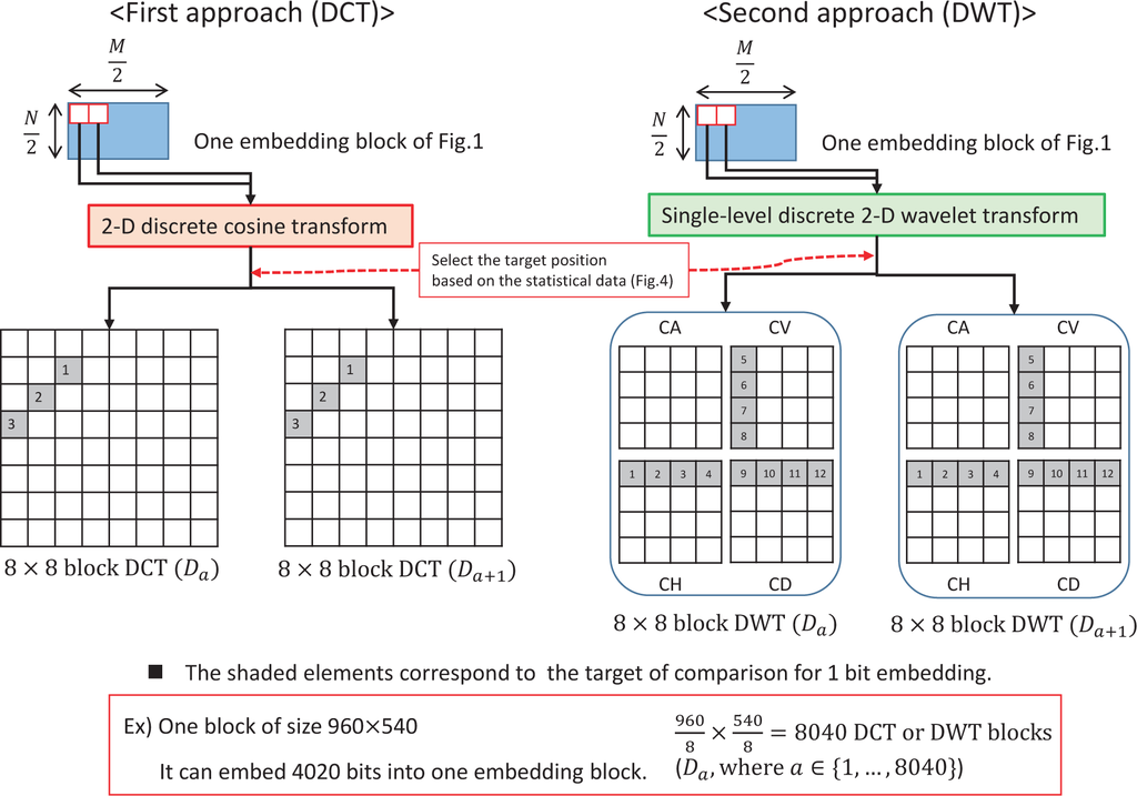 In the first approach, a DCT was applied to an 8 × 8 pixel block-unit in one embedding block (960 × 540) to produce an