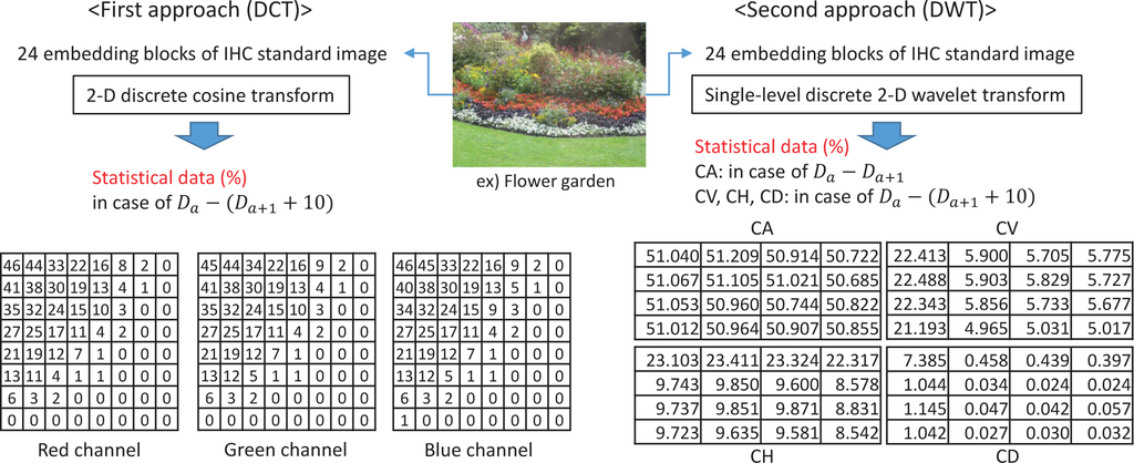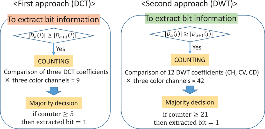 - The total comparison number is 3 × 3 = 9 (comparison of three DCT coefficients × three color channels). In the case of DWT, 12 × 3 = 42 are compared from the selected detail wavelet coefficients (comparison of 12 DWT coefficients × three color channels).