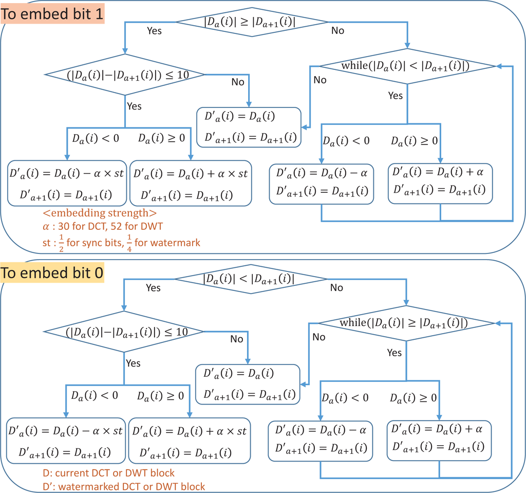 - Let bw ∈ {0, 1} be the embedded value. Modify the DCT or DWT coefficient values in block Da according to the following rules.