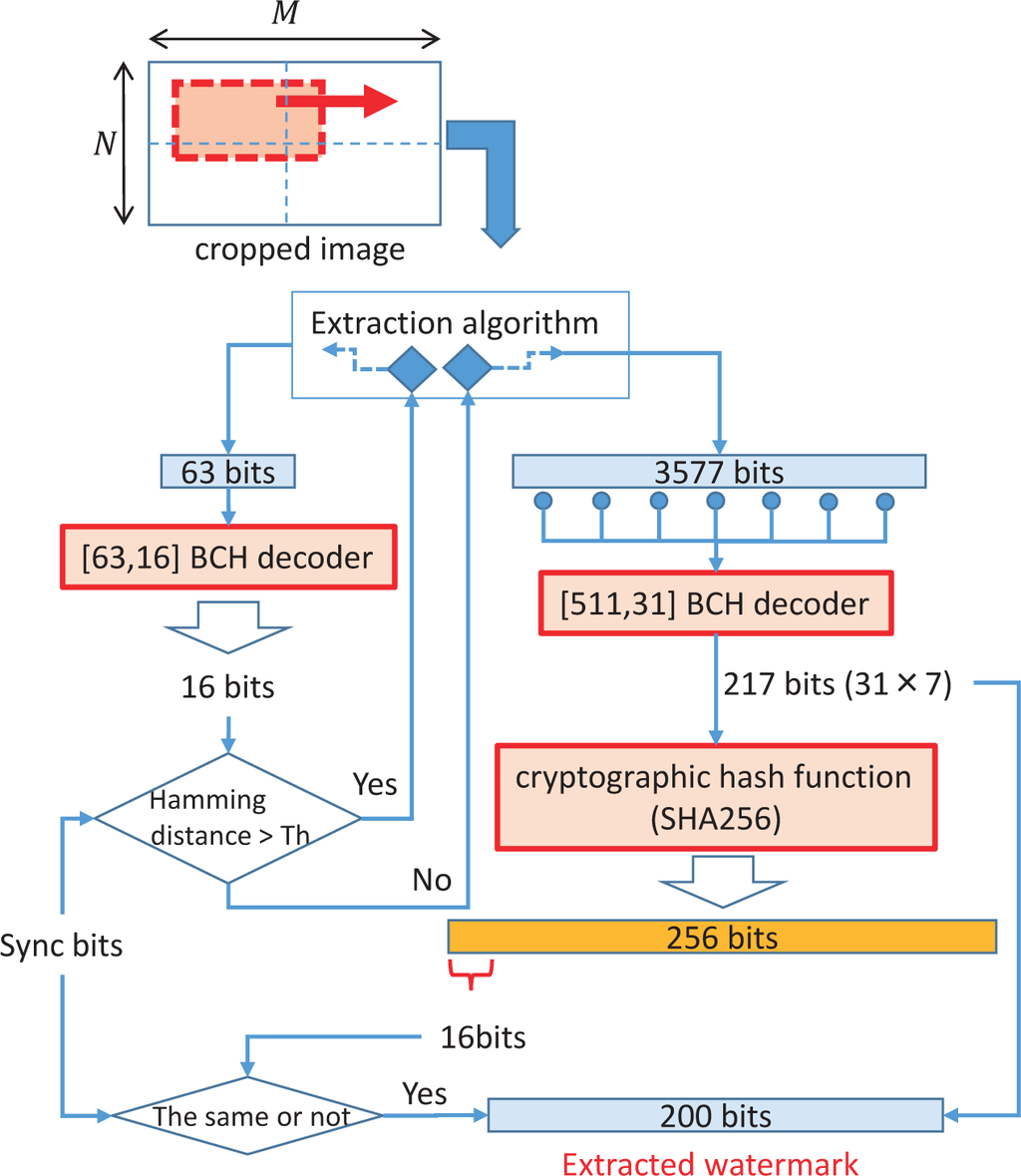 - Extract 63 bits from a selected embedding block and obtain 16 bits using the BCH decoder.