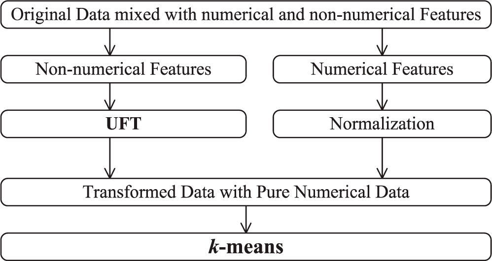 for the original non-numerical feature X can be generated. Besides, the values of transformed feature can be normalized at the same time. Combining the UFT with k-means, data mixed with numerical and non-numerical features can be unified to be purely numerical and then clustered effectively. Figure 1 shows the experimental design of UFT-k-means.