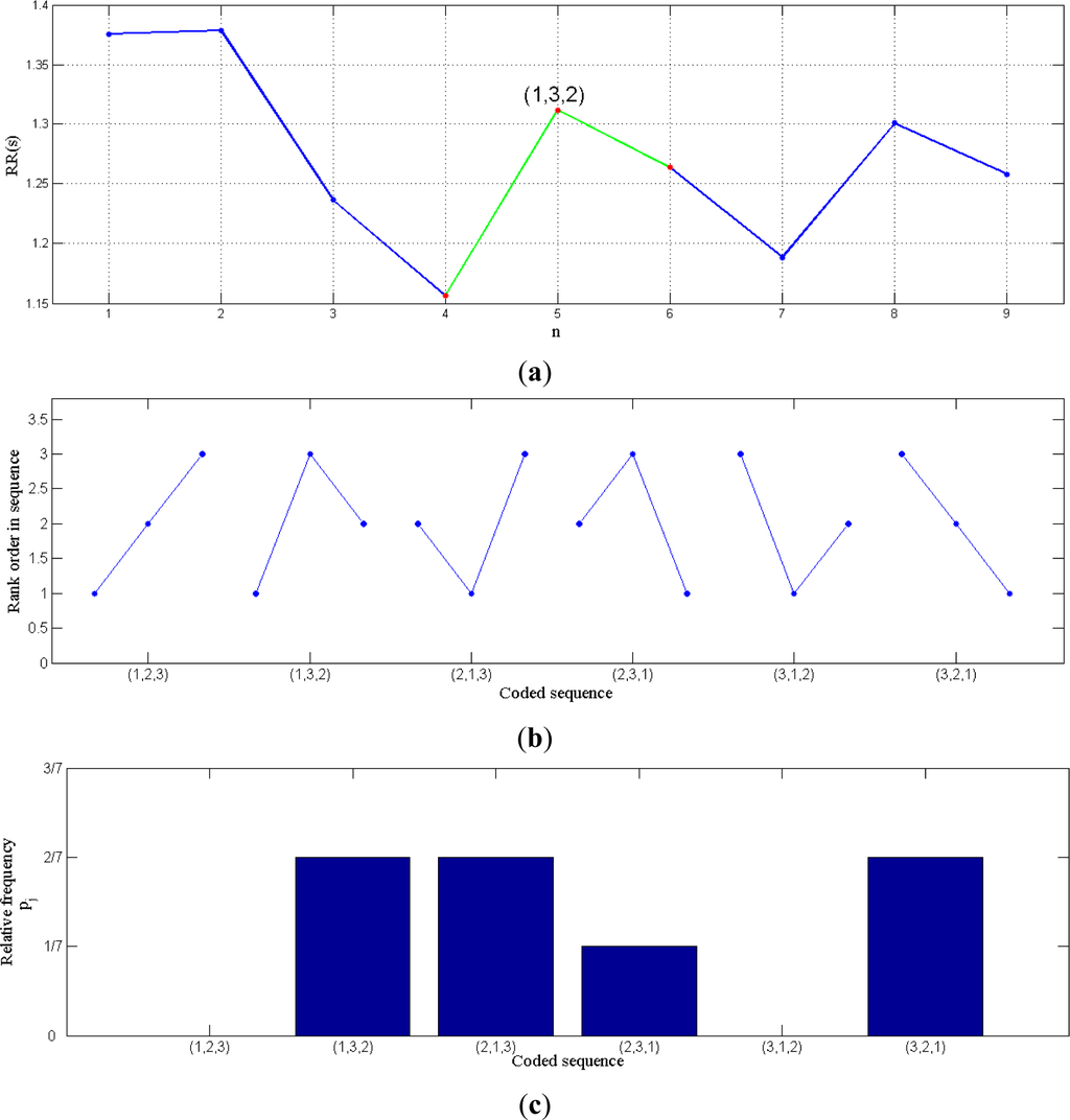 The example shown in Figure 1 allows us to see how the permutation entropy can be applied to any data series and to RR intervals in particular. In (a), an example of RR intervals is showed, and in (b) all the possible symbols in case of n = 3 are displayed. The next step in the encoding process consists in calculating the relative frequency of each symbol (for instance Figure 1c represents the frequencies of the sequences in the signal of Figure 1a). Finally, Equation (2) is applied to the corresponding relative frequencies.
