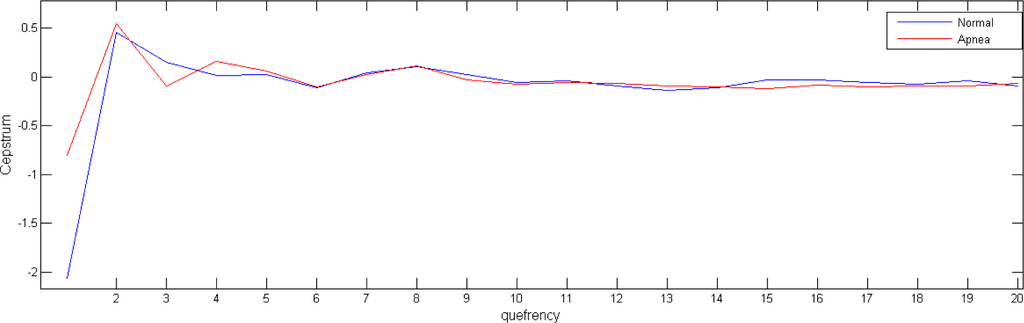 Cepstrum is a well known technique for signal analysis and feature extraction. It has been widely used in different applications such as speech analysis, echo detection and removal, or machine diagnostics. In previous studies we have also applied cepstrum coefficients for OSA identification [17,18]. This technique is useful to detect repeated patterns or periodicities in a frequency spectrum, as they will be sensed as specific significant components in the cepstrum.