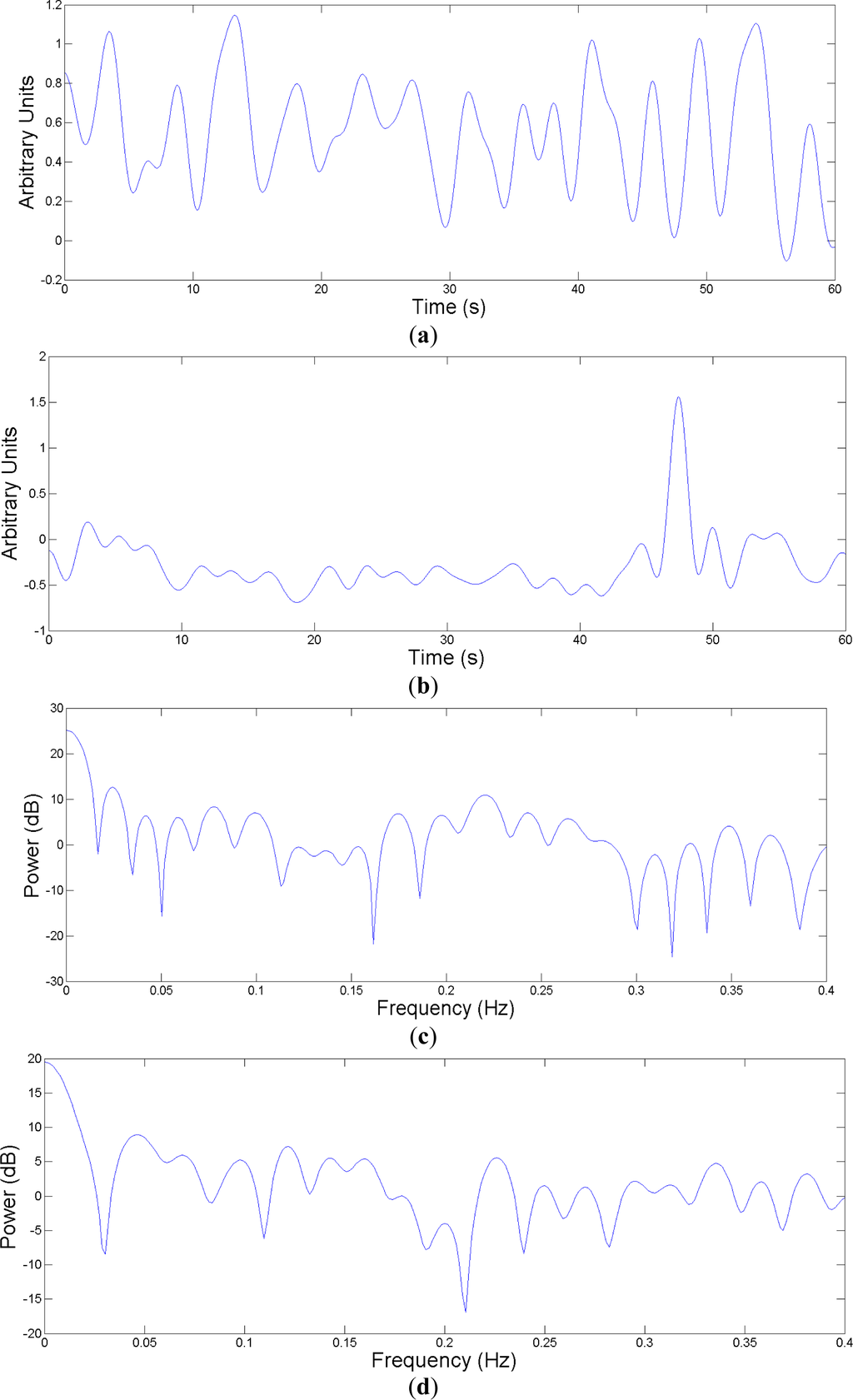 (a) 1 minute-EDR of a normal breathing; (b) One minute-EDR of an apnea event; (c) and (d) Power spectral density estimates of (a) and (b) respectively.