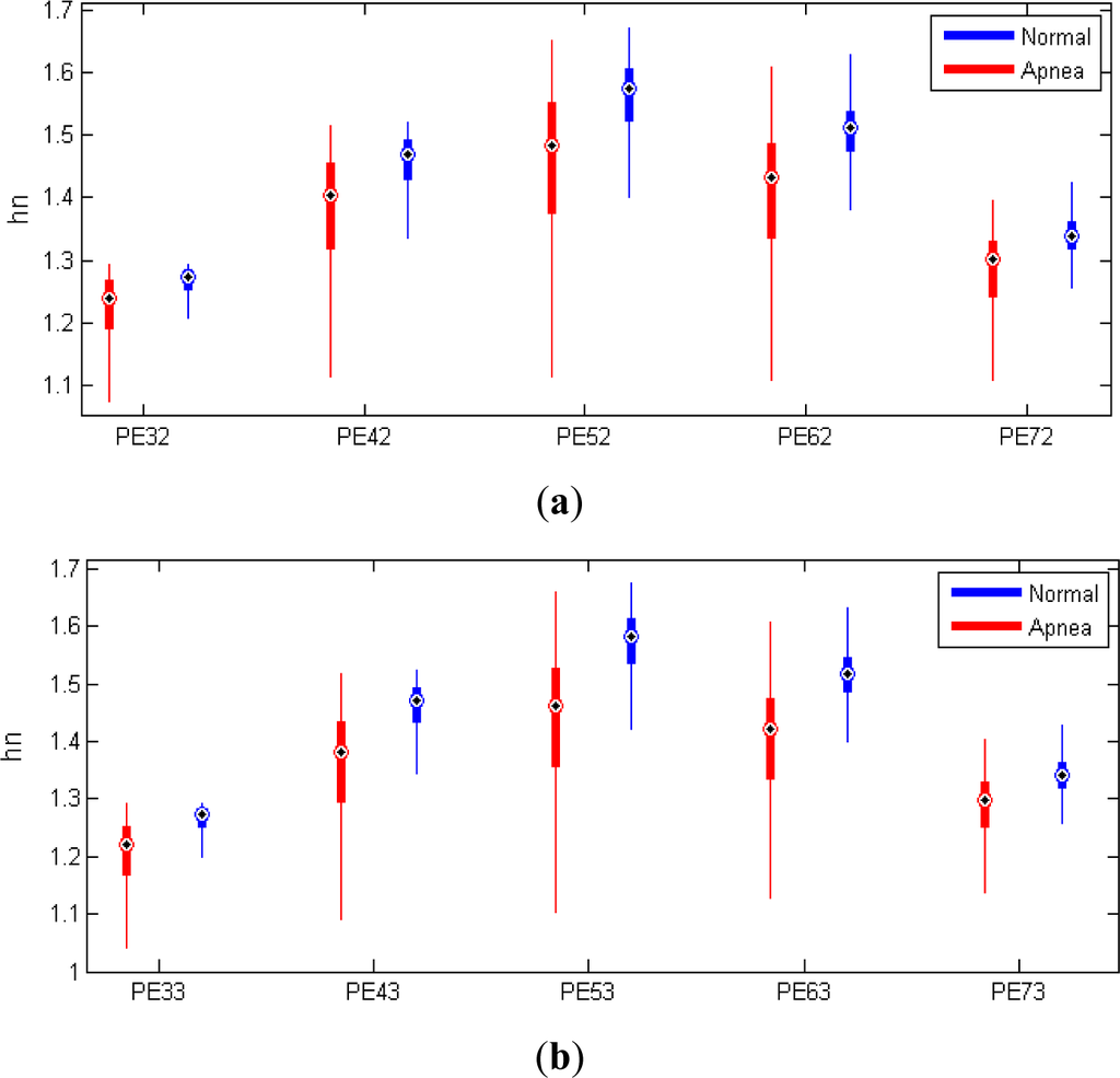 Boxplot for the variables PEnt in apnea and normal segments for different values of order n and delay t. (a) Order = 2; (b) Order = 3.