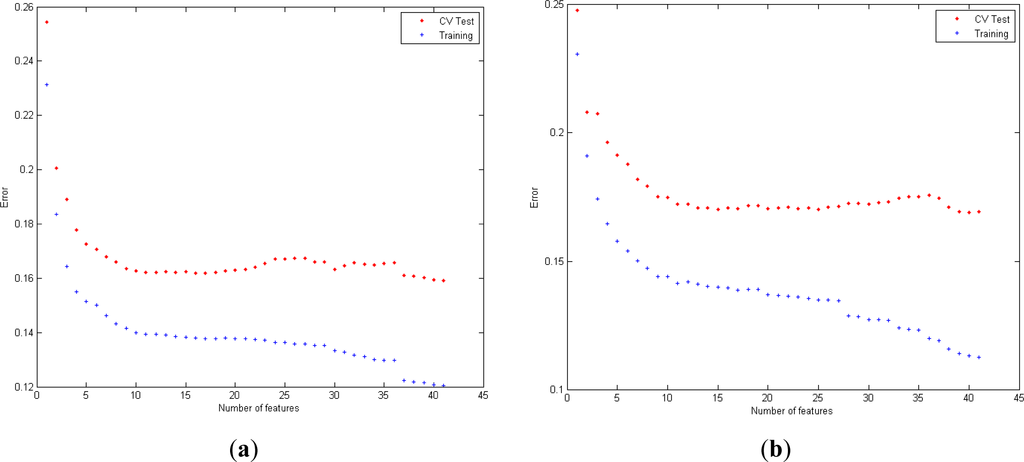 Evaluation of misclassification error for variables obtained from EDR+Cepstrum+PE series with LR classifier (a) and with QDA classifier (b).