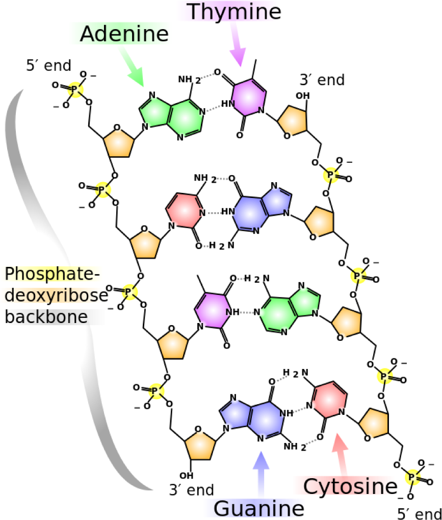 Human DNA is composed of 23 chromosomes (of diverse lengths) with an average of 30 to 200 million base pairs per chromosome (thus giving it a total of three billion base pairs). A base pair encodes a Watson–Crick complement (when a double-stranded molecular structure, such as DNA, is being described) with a letter, representing adenine, cytosine, guanine and thymine (and its respective complement), which are the molecules that form DNA in all species. “Base pair” can also refer to a unit of length that covers exactly one nucleic acid (and its complement). In Figure 1, the chemical structure of DNA and the corresponding nucleotides (also called nucleic acids) are illustrated.
