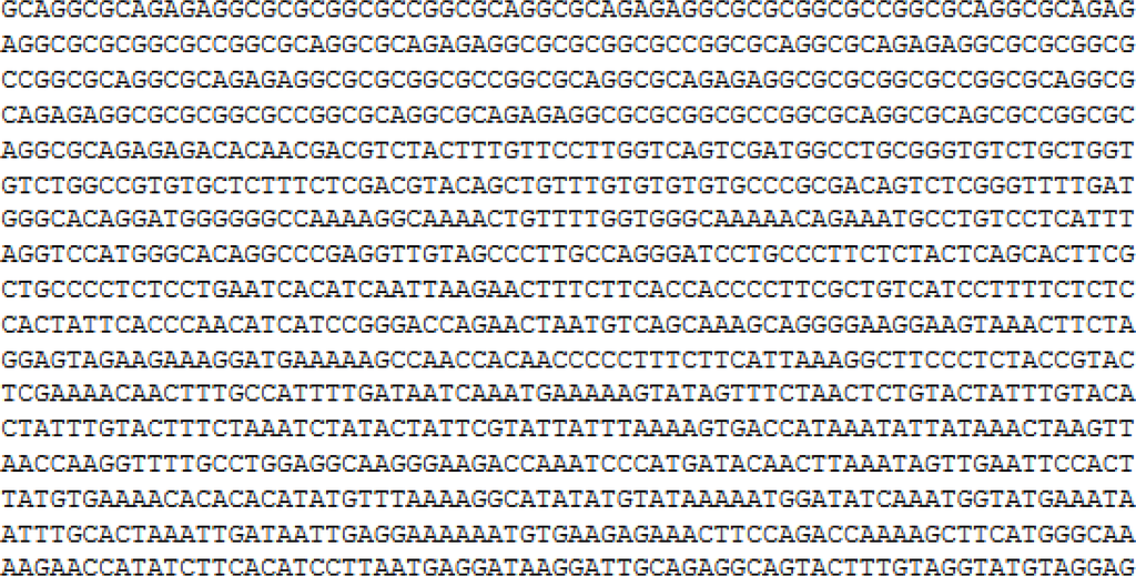 When a genome is sequenced, it means that either experts or machines have identified each base pair in the molecule of DNA, and that sequence of symbols (a letter for each nucleotide) is saved into databases as a sequence. In Figure 2, a fragment that has been sequenced is illustrated.