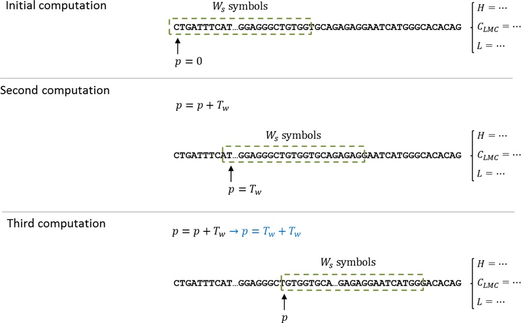 Since the calculation of complexity measures requires a set of data, and not one single value, a technique based on windows was selected to produce a sequence of measures for the DNA dataset. The computation of the complexity measures is done by a shifting window, called W, of size Ws. The measure is computed for the DNA subsequence, starting at position p = 0 and with a length of Ws. The resulting value is stored, for later processing, and the starting position is shifted Tw, that is, pnext = p + Tw; then, the computation continues until an end-of-string indicator has been triggered. As explained above, the predictor has two parameters (window size and window shift) and is evaluated for each complexity measure defined in Section 3. Figure 3 illustrates the window process and how it manages to cover the entire sequence in less computational time.