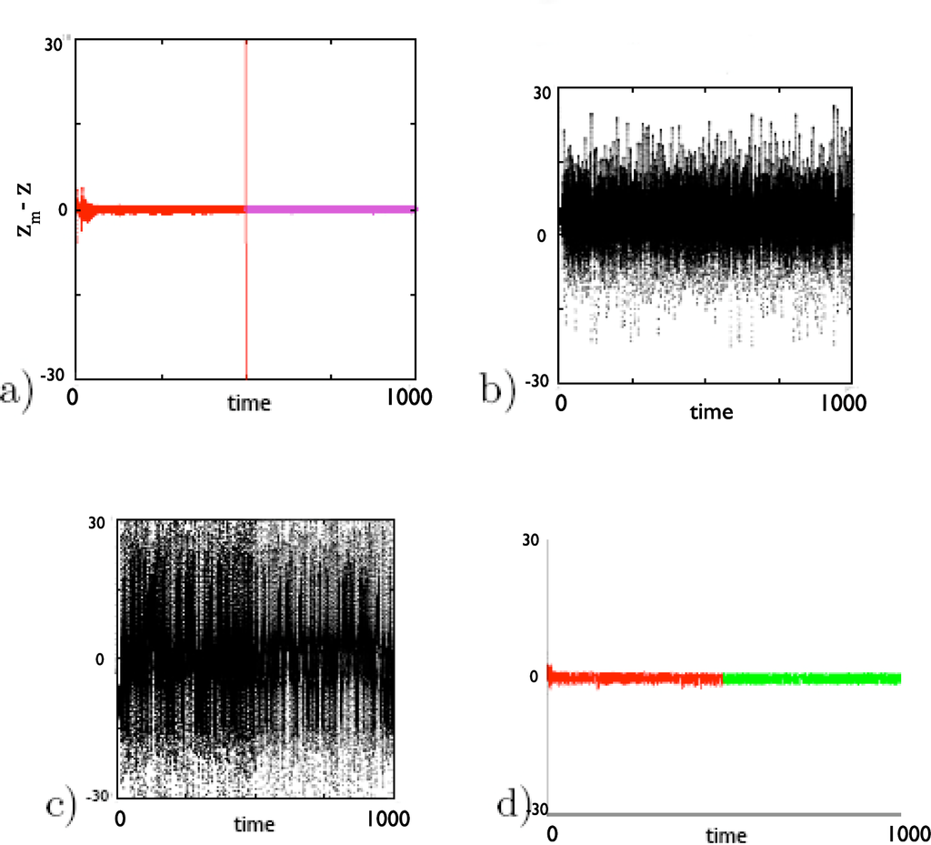 subsequently held fixed values. (The three models also synchronized among themselves nearly identically.) Second, the inter-model connections are needed, despite efforts, common in the modeling community [63], to combine only the outputs of independently run models using Bayesian reasoning. The difference between corresponding variables in the “real” and coupled “model” systems was significantly less than the difference using the average outputs of the same suite of models, not coupled among themselves (Figure 10b). Further, without the model-model coupling, the output of the single model with the best equation for the given variable (in this case, z, modeled best by z1 in Model 1) differed even more from “reality” than the average output of the three models (Figure 10c). Therefore, it is unlikely that any ex post facto weighting scheme applied to the three outputs would give results equaling those of the synchronized suite. Internal synchronization within the multi-model “mind” is essential. Third, the choice of semi-autonomous models to be combined is not essential, as long as the “gene pool” of models is diverse. In a case where no model had the “correct” equation for any variable, results deteriorated only slightly (Figure 10d).
