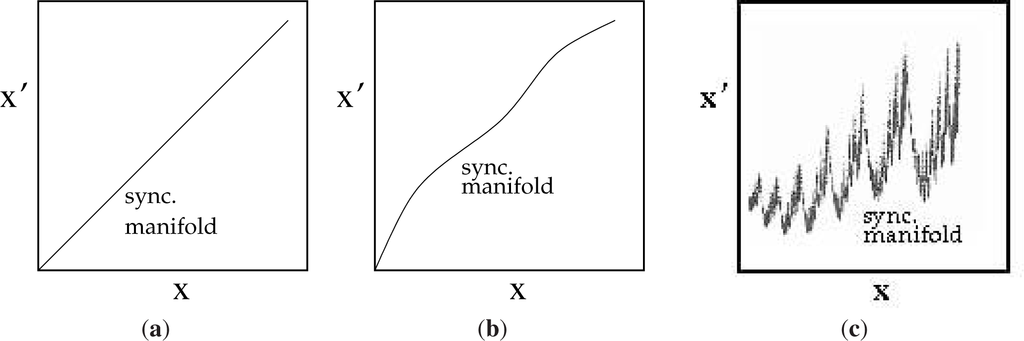 Synchronization can indeed occur with weaker forms of coupling than the complete replacement of one variable by its corresponding variable as in (1), but degrades below a threshold coupling strength. Typically, synchronization degrades via on-off intermittency [19], where bursts of desynchronization occur at irregular intervals or as “generalized” synchronization [20], where a strict correspondence remains between the two systems, but that correspondence is given by a less tractable function than the identity. As shown schematically in Figure 3, as differences between the two systems increase, the correspondence changes from the identity to a smooth function that approximates the identity, to one given by a function that is nowhere differentiable. The last case is in fact common [21].
