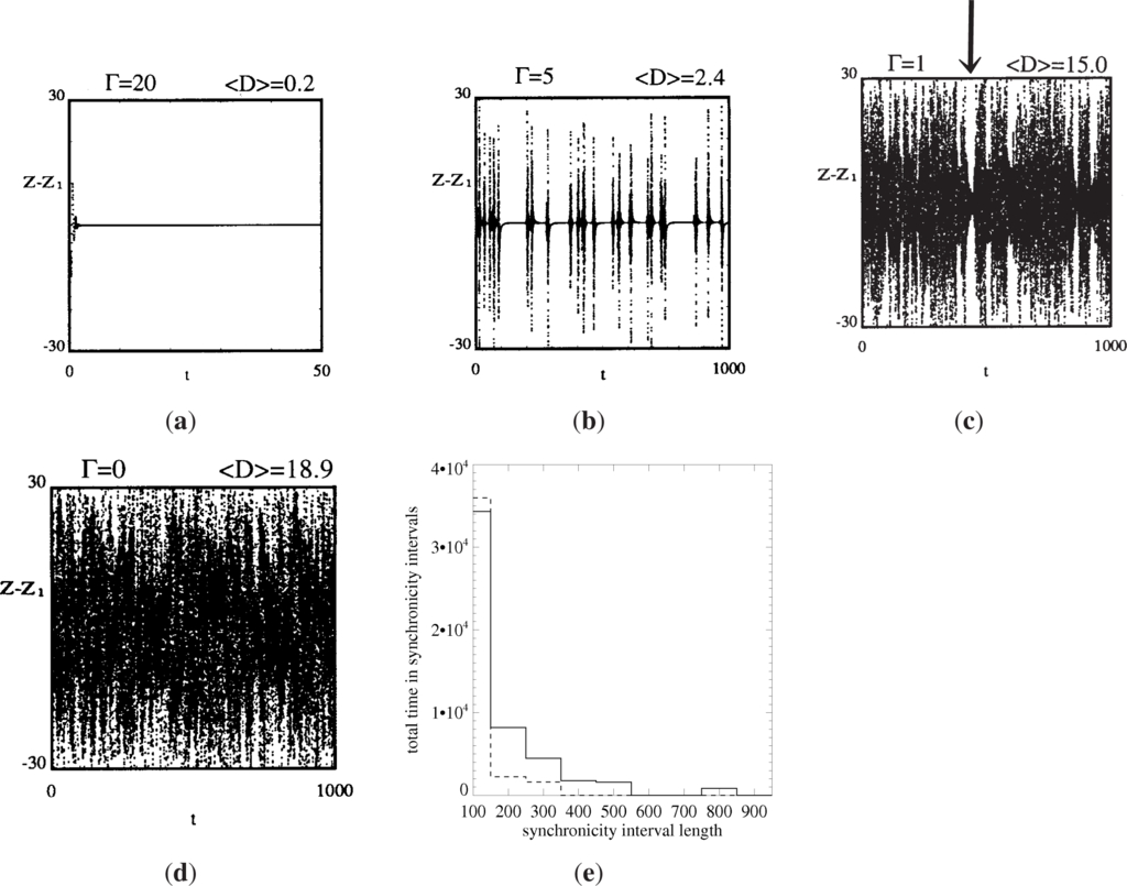 The difference between the simultaneous states of two Lorenz systems with time-lagged coupling (2), with σ = 10., ρ = 28., and β = 8/3, represented by Z(t) − Z1(t) vs. t for various values of the inverse time lag Γ illustrating complete synchronization (a), intermittent or “on-off” synchronization (b), partial synchronization (c) and de-coupled systems (d). The average Euclidean distance ⟨D⟩ between the states of the two systems in X, Y, Z-space is also shown. A histogram of the lengths of periods of “synchronicity”, such as the one indicated by the arrow in (c), is shown in (e) for the time-delayed coupling case (solid line) and a case of two unrelated Lorenz trajectories (dashed line), where synchronicity intervals are periods during which |Z(t) − Z1(t)| < 5.