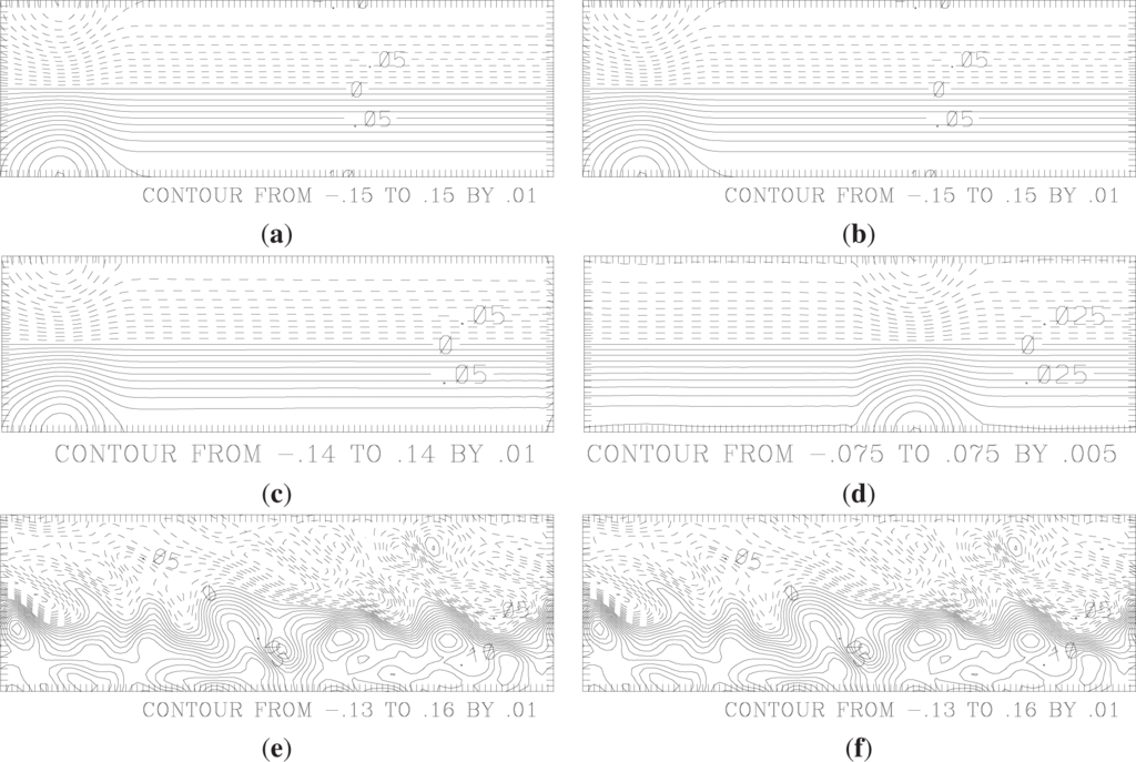 Stream function (in units of 1.48 × 109 m2s−1) describing the forcing ψ* (a,b), and the evolving flow ψ (c–f), in a parallel channel model with coupling of medium-scale modes for which |kx| > kx0 = 3 or |ky| > ky0 = 2, and |k| ≤ 15, for the indicated numbers n of time steps in a numerical integration (generalizing to bidirectional coupling, for convenience). Parameters are as described previously [5]. An average stream function for the two vertical layers i = 1, 2 is shown. Synchronization occurs by the last time shown (e,f), despite differing initial conditions (c,d).