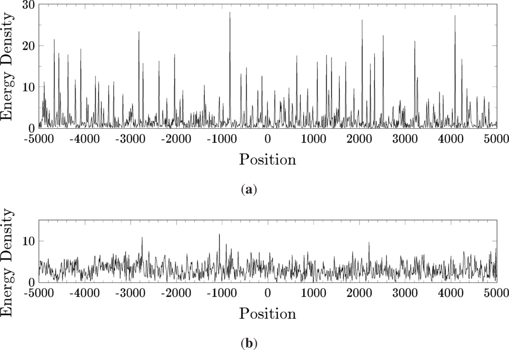 Energy density ρ = (1/2)e−Ht(ϕx)2 + (1/2)eHt(ϕt)2 + eHtV (ϕ) vs. position x for a numerical simulation of the Scalar Field Equation (4) with the potential V(ϕ) = (1/2)ϕ 2 − (1/4)ϕ4 + (1/6)ϕ 6, exhibiting localized oscillons (a), and a simulation of the same equation, but with a different potential V(ϕ) = (1/2)ϕ2 + (1/4)ϕ4 + (1/6)ϕ6, for which oscillons do not occur (b).