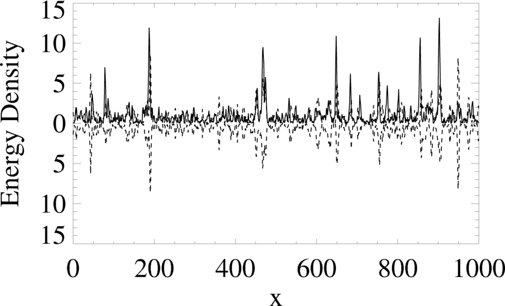 The local energy density ρ vs. x for two simulations (solid and dashed lines) of the Scalar Field Equation (4), coupled to one another only through modes of wavenumber k ≤ 64, where modes up to kmax = 214 are realized numerically (ρ for the second system (dashed line) is also shown reflected across the x-axis for the ease of comparison). The coincidence of oscillon positions is apparent.