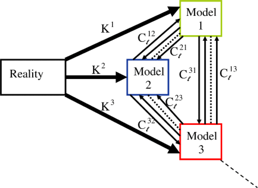 The above scheme for the fusion of imperfect computational/mental models only requires that the models come equipped with a procedure to assimilate new measurements from an objective process in real time and, hence, from one another. Such procedures are indeed available for the long-range climate projection models, which differ significantly among themselves in regard to the magnitude and regional characteristics of expected global warming [64] (to project 21st century climate, the models are disconnected from reality after training, parameters are altered slightly to represent increased greenhouse gas levels, and one assesses changes in the overall shape of the attractor). Toward the intended application, results with Lorenz systems were thoroughly confirmed and extended using a learning method that minimizes synchronization error over finite-length trajectories, instead of the instantaneous error as above, to determine inter-model connections [60,61]. The scheme could also be applied to financial, physiological or ecological models. It could conceivably also describe the combination of individuals to form a society (cf. [65]), in models and in reality.