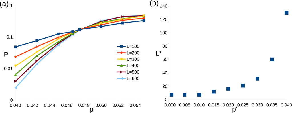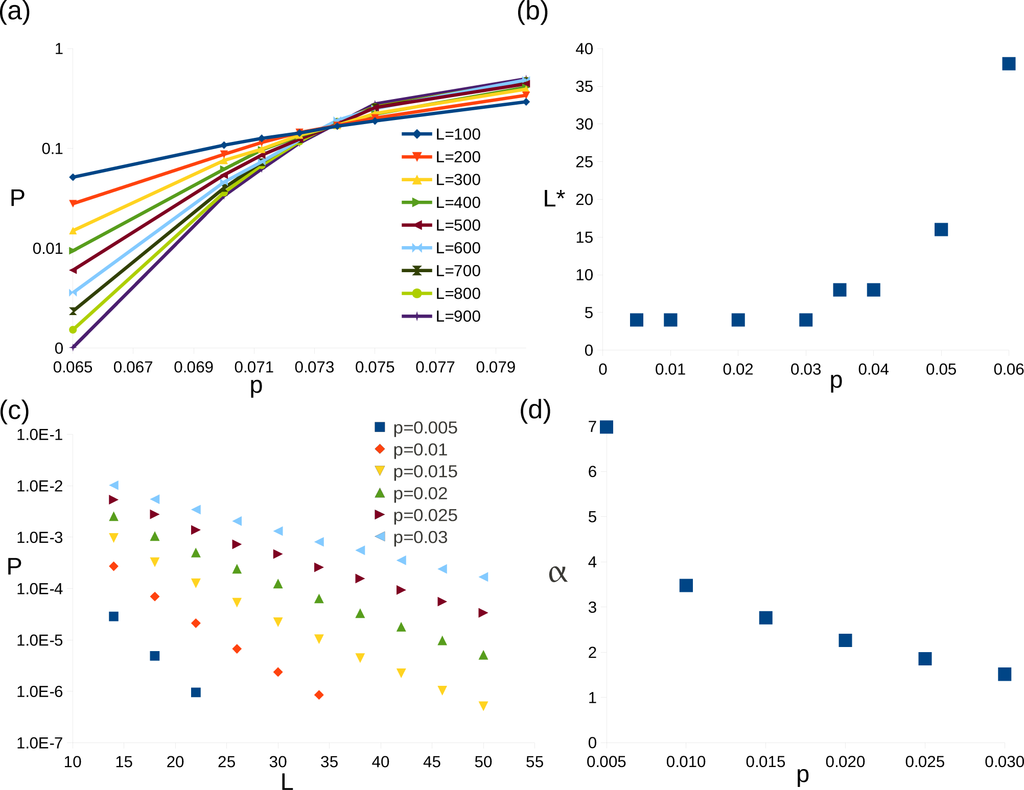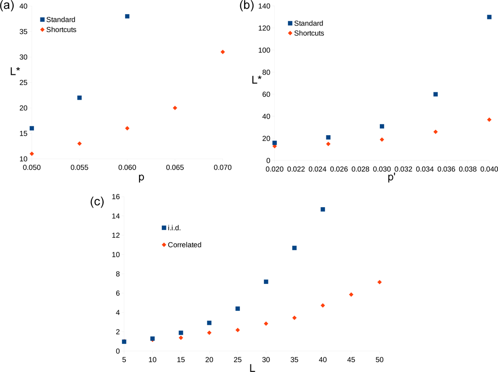 In Figure 4 data is presented to compare the results of decoder when these redefined distances are used to that when they are not. These are referred to as the “shortcut” and “standard” methods, respectively. Due to the way the shortcut method is implemented, it is more difficult to obtain results for large system sizes. As such, a direct comparison of thresholds is not made. Instead the system size L* is compared for both the correlated and uncorrelated error models. It is found that the shortcuts offer no significant advantages for low error rates, for which the corresponding L* is small. However, for larger error rates the growth of L* with p and p′ is found to be much slower when the shortcuts are used, and so the same degree of error suppression can be achieved with much smaller systems.