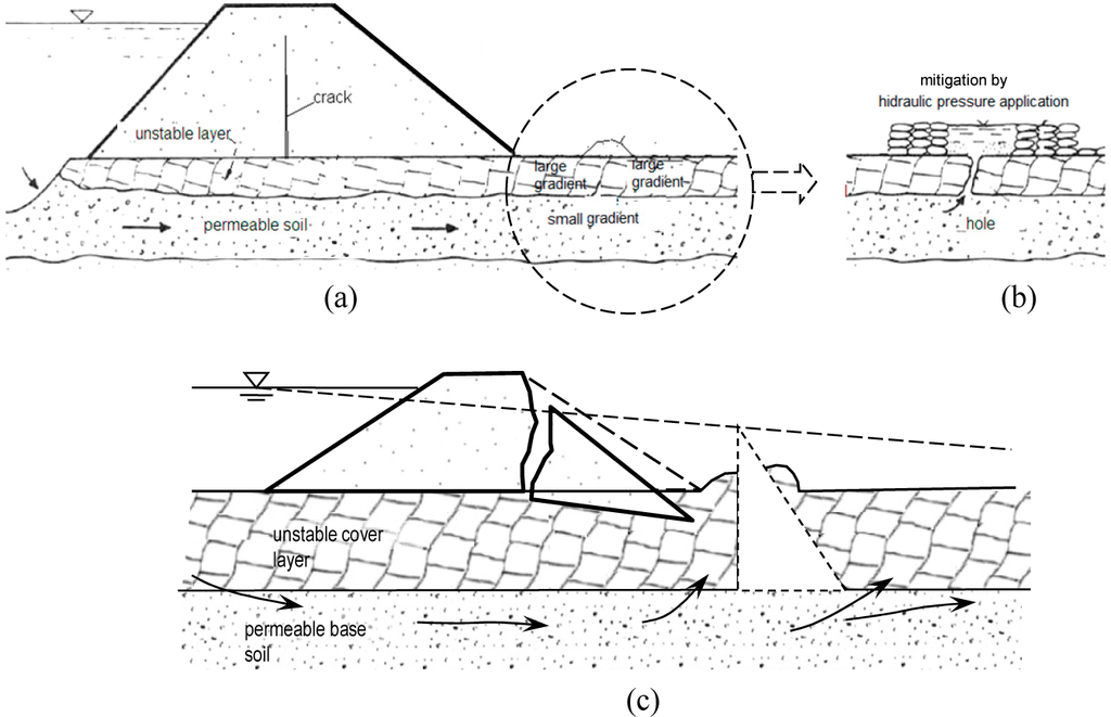 Piping in two-layer system (a) and (b) slow piping: (a) Sand boil with sand transport, and crack due to localized collapse, and (b) the mitigation of slow piping by hydraulic surcharging on the land-side (after [7]). (c) Fast piping on thick and loose cover layer, deposited in an old meander with arching; this process also starts with a sand boil (adapted from [3]).