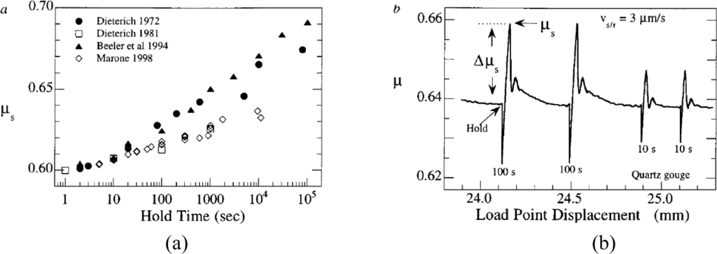 It is well known that the value of the static friction is larger than the dynamic friction, and that the friction law in experiments has a stick and slip nature. In rock mechanics, the phenomenon of sliding friction is understood in terms of the so-called rate- and state-dependent friction laws ([30]). These laws unify the results obtained from two types of rock experiments, being: the time dependence of static coefficient of friction; and the slip velocity dependence of the dynamic coefficient of friction. They show that the static friction increases with time (Figure 10a) and that the friction suddenly decreases with displacement (Figure 10b).