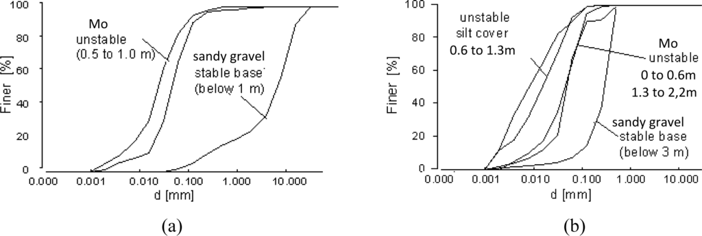 The particle migration criterion (Figure 2b) was elaborated on the basis of vertical water flow tests (“suffosion or wash-out tests”) made on artificial mixtures of natural soil grains [13]. In these tests, the soil is placed into a cylindrical permeameter (20 cm height and 10 cm diameter) bounded at the bottom by a sieve. The mesh would permit passage of particles smaller than 1.2 mm but retain particles larger than 1.2 mm. The downward hydraulic gradient is between 4 and 5. By characterizing the sands from the top and bottom parts of the permeameter at the end of the test, the particle movements can be detected.