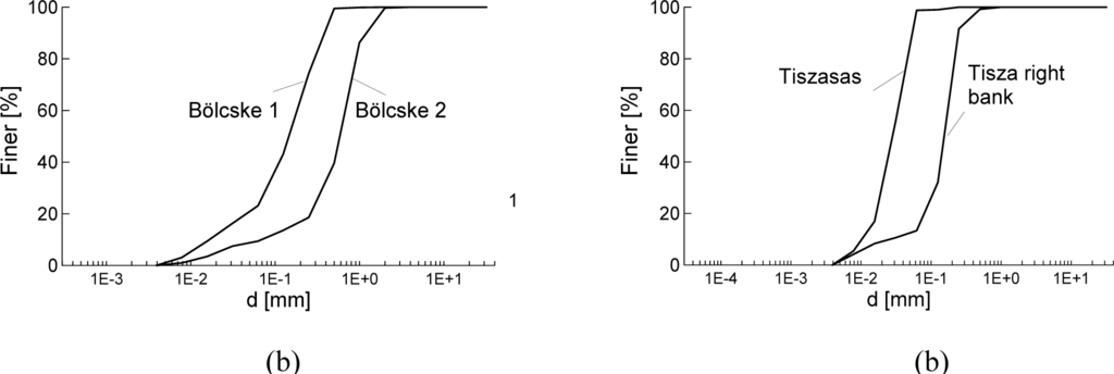 Grading curves for the Danube dike case studies. The numbers represent borehole numbers and depths with reference to Table 1. (a) Dunakiliti soils. (b) Dunafalva soils.