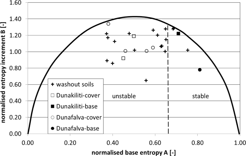 Representing the results in terms of the entropy increment B and the relative base entropy A, the soil structure stability zones were identified (note only half of the symmetric diagram is shown).