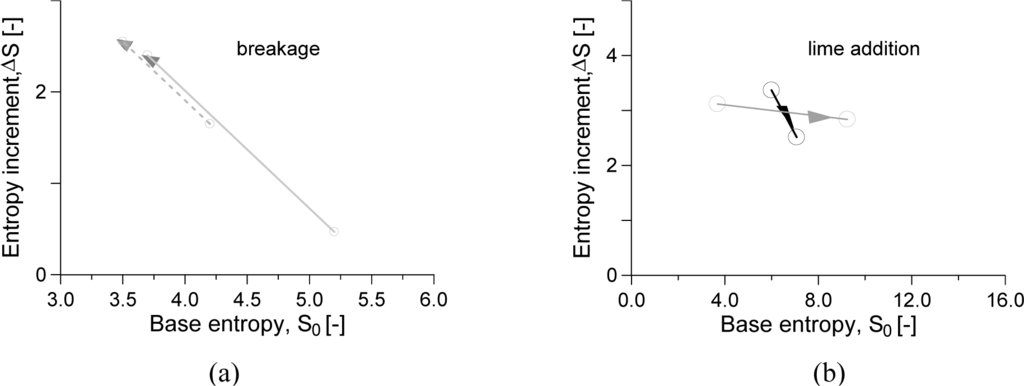 The entropy paths for (a) breakage (spontaneous) and (b) agglomeration (lime modification; artificial).