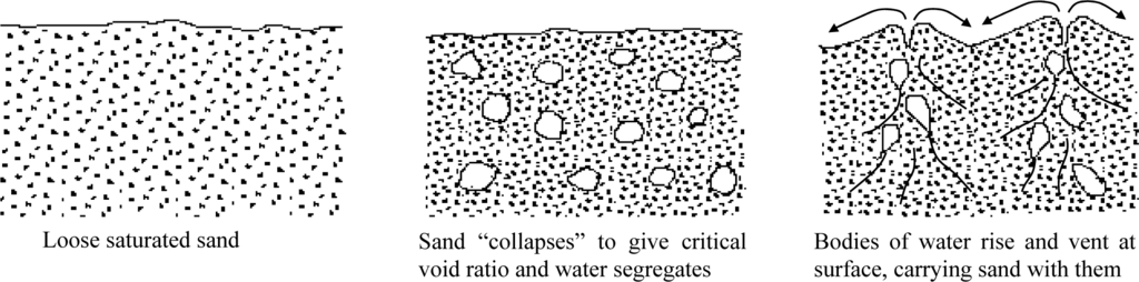 The two sides of dike may move apart slightly if shear strains become too large, with sudden cracking at the axis of the dike due to the change from a state of static to dynamic frictional resistance. Local liquefaction may be caused by the shear waves produced by cracking of the dam body. This liquefaction allows any segregated water to rise upward, through the cover layer, to form a sand boil, which establishes a mechanism for soil ejection.