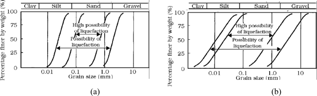 The liquefaction criteria of Tsuchida (a) for soils with small uniformity coefficient and (b) soils with large uniformity coefficient.