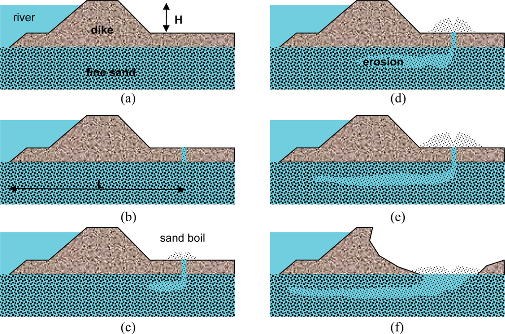 Three phases are identified preceding failure: in the first phase, some micro-pipes are formed; in the second phase, elementary small boils are formed, with erosion of some small grains due to some liquefaction effects; then, a concentrated water spout or geyser appears which ejects the larger grains and forms a crater, around which the detached soil is deposited. If not mitigated at this point, the erosion may develop further, leading to failure.
