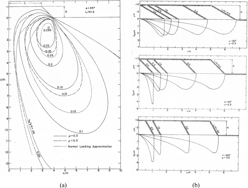 Shear stress beneath a trapezoidal dike: (a) Contours of shear stress, τxy; (b) Distributions of shear stress, τxy/γH on the base of the embankment for varying slope and L/H ratios (from [28]).