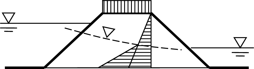 The loads on a dike during a flood. The river-side shear stress decreases and the landside shear stress increases due to the horizontal force arising from the flood water (adapted from [3]).