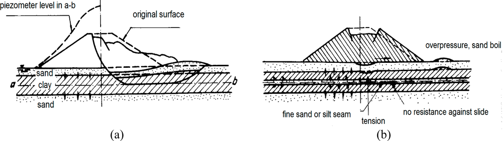 Although it is not directly related to the discussion of piping phenomena, it is important to note that the effects of shear stress in the base beneath a dike is also significant in other failure phenomena. Two reported situations are noteworthy [27,29]: the case of a soft clay or peat base and the case of an enclosed, thin silt or fine sand layer. In each case, shown in Figure 8, the shear conditions can be considered to be undrained and a sand boil can develop. In case of clay or peat (see e.g. [29]), it is well-recognized that the lateral displacements of the embankments may result in longitudinal cracking. In the case of a confined, thin silt or fine sand layer, they can even lead to complete failure [27].
