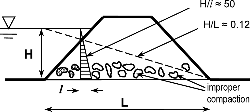 There are situations where poor compaction of the soil in the dyke itself can contribute to dynamic effects which in turn, can affect the stability of underlying soils ([3]). Such a situation is shown in Figure 9, where seepage flow through the dyke during a flood exploits voids in the compacted soil. Several phenomena may result. By flowing through saturated voids, where present, the seepage length is effectively shortened, thereby increasing the hydraulic gradient for water flowing through intact soil, leading to localized internal erosion. Localized saturation of the void walls can lead them to collapse. In other areas, where voids remain air-filled, water flow is interrupted. These irregularities in the flow conditions and soil restructuring can cause dynamic effects as a seepage front is established in a rising flood, and cause aberrations in the pore pressure conditions, which can affect the stress state in the dyke.