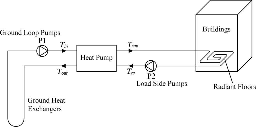 A schematic diagram of the system under investigation is shown in Figure 1. Vertical 1.26 inch nominal diameter U-bend ground heat exchangers are installed. Forty 60 m-depth boreholes are arranged around the two buildings. According to the local climate and experience operating other GCHP applications, the circulating water in the ground loop of GCHP systems in South China does not freeze in winter, therefore, water is used as the circulating fluid in the ground loop. The water in the ground loop is circulated through the evaporator of a water-to-water heat pump equipped with a screw compressor, and returns to the GHE after rejecting heat in the evaporator. The heat pump receives heat from the circulating water in the ground loop, and rejects heat in the condenser to the circulating water in the heat distribution system. The heated circulating water is then pumped to the terminals to heat the rooms.