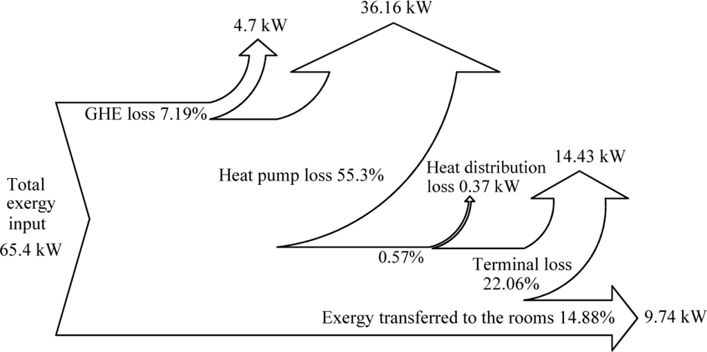 - The analysis results indicate that the largest exergy loss occurs in heat pump, and the second largest exergy loss occurs in terminals. The ground heat exchange system has the lowest exergy efficiency among the four subsystems. Designers of GCHP systems should pay close attention to the selection of heat pumps and terminals, especially to the design of ground heat exchange systems.