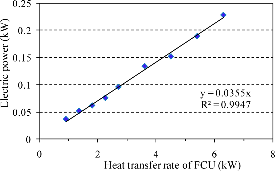The electric power of FCU is generally linearly related to the heat transfer rate of FCU, and can be calculated by following fitting formula: