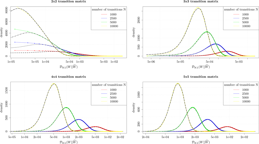 In order to evaluate the quality of the distributional approximation we have performed numerical simulations and compared the density of the approximate distribution in Equation (16) with density obtained through Monte Carlo simulations. We have generated densities of Kullback-Leibler divergence through Monte Carlo simulations for 2-by-2, 3-by-3, 4-by-4 and 5-by-5 transition probability matrices modeling first order Markov processes. The matrix W is selected in a random manner and we generate 50,000 realizations of