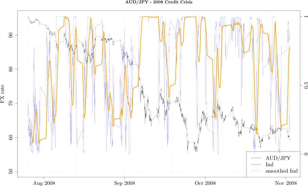 Figure 2 shows the tick-by-tick AUD/JPY exchange rate (black curve) during the period from August 2008 till end of November 2008, along with the Iml (blue curve) and Iml smoothed with 20 point moving average (orange curve). While during the month of August 2008 as the exchange rate was slowly moving lower, the measurement gently oscillated around values close to zero, indicating the AUD/JPY exchange rate exhibits usual property of fast decaying autocorrelation. The rapid decline in the exchange rate of almost 30% corresponds to the month of September 2008 when the measurement has a value close to 1, indicating that the lower order Markov process is not a good approximation of the higher order Markov process. In other words, over this dramatic period the price movement as mapped onto a fixed grid exhibits memory beyond the first order Markov process. This is intuitive as the sharp downward movement of the FX rate, when autocorrelation drastically increases, cannot be captured by low order Markov processes. As it turns out, during the month of September 2008 many financial markets around the world crashed as Lehman Brothers filed for bankruptcy, and our measurement seems to be able to capture this unusual activity.