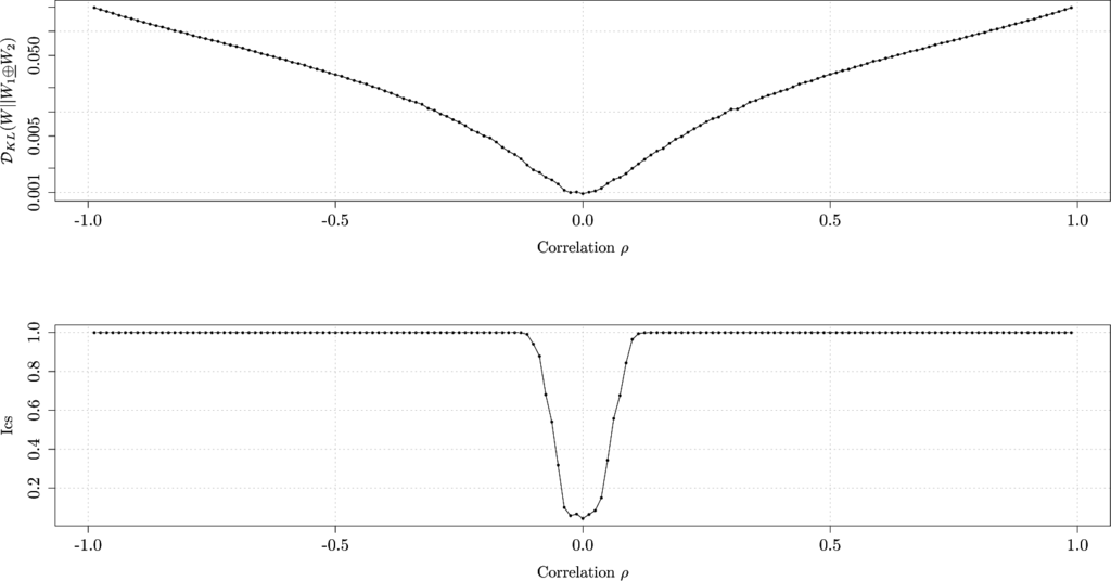 The upper graph shows the Kullback-Leibler divergence, while the lower graph shows the Ics, between the joint Markov process modeled by W and its independent counterpart modeled by the structureless transition probability matrix W1⊕W2, as a function of correlation coefficient ρ linking two time series together.