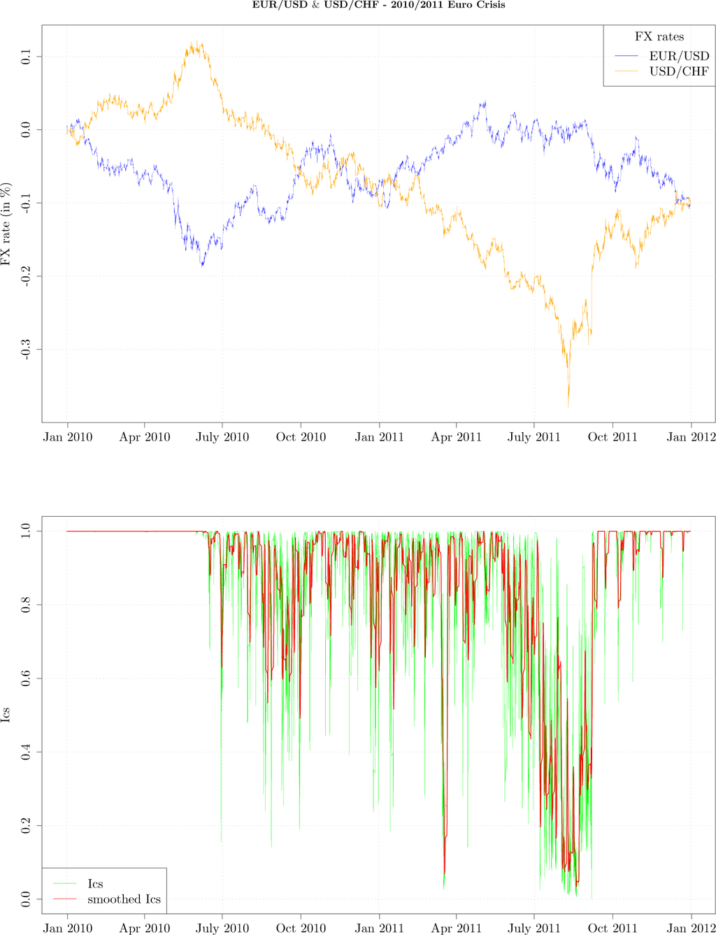 The figure graphs the EUR/USD (blue) and USD/CHF (orange) exchange rate during the unfolding of 2010–2011 Euro Crisis and hourly Ics (green curve) and Ics smoothed with 20 point moving average (red curve), whereas all processes are modeled as third order Markov processes.